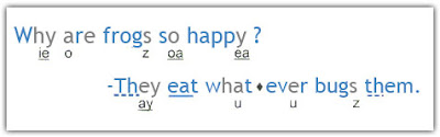 The program provides ‘helpers’ for your child to that show how to pronounce various words. As your child progresses, the helps are removed. By the end of the program, your child is even learning how Greek and Latin roots affect how words are pronounced. This is an example of how non-phonetic words are worked through in the program {blue letters keep their sounds and the other blends/combinations are shown below the letters}.